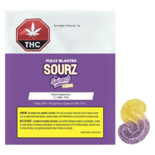 Prepare for your tastebuds to blast off. SOURZ by Spinach Fully Blasted Peach Passionfruit 1:1 CBN | THC gummies feature a combination of luscious peach and tart passionfruit flavours. With a balanced blend of 10mg THC and 10mg CBN per piece. This dual-flavoured gummy is over-the-top with natural flavours and blasted with sour crystals. Enjoy one gummy per pack, 10mg THC total and 10mg CBN total.